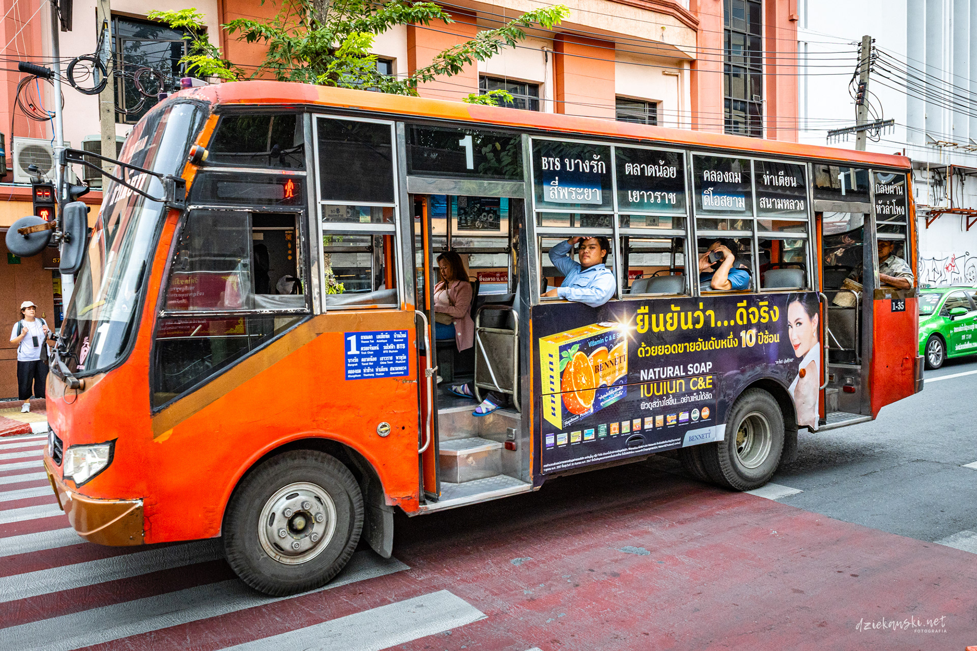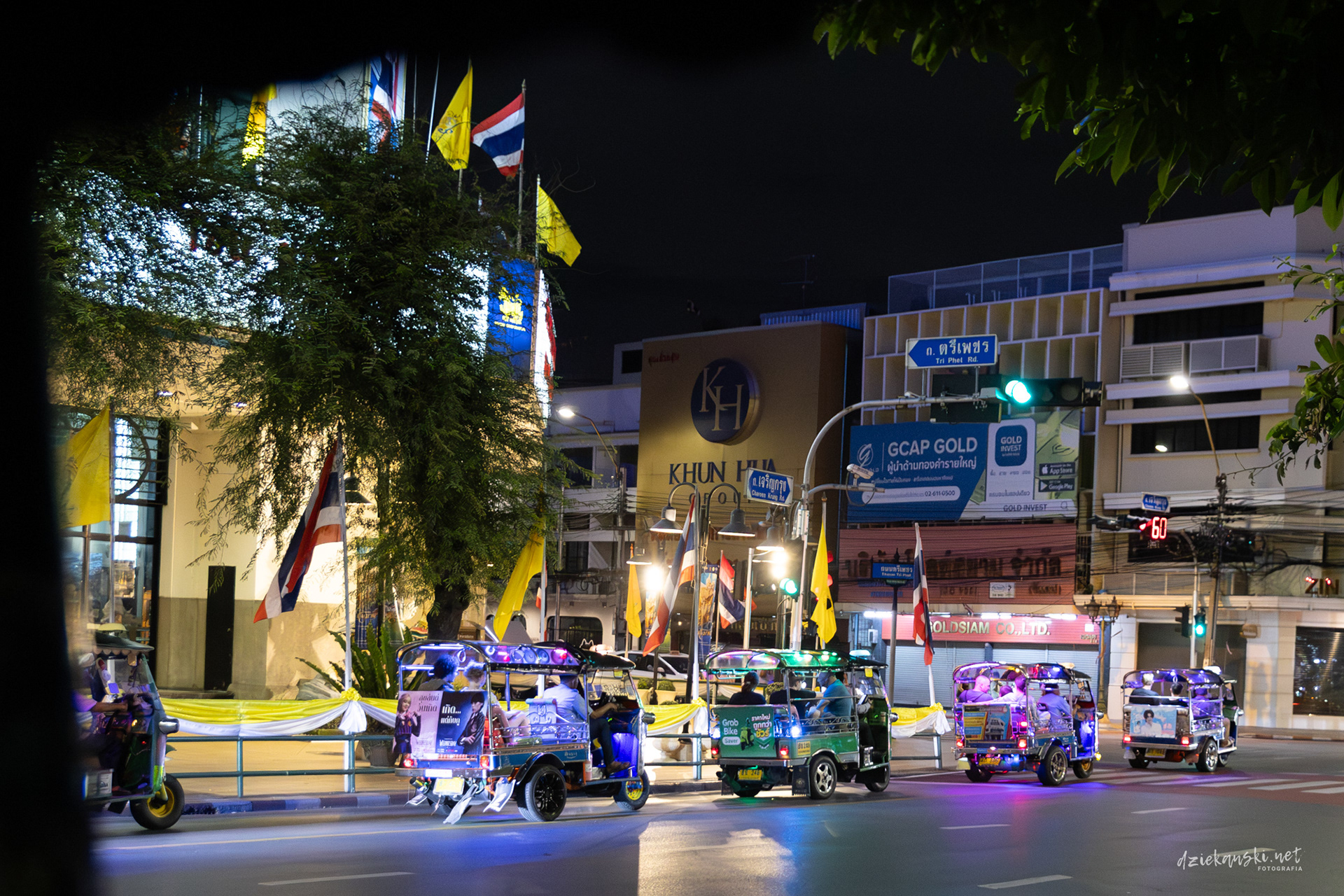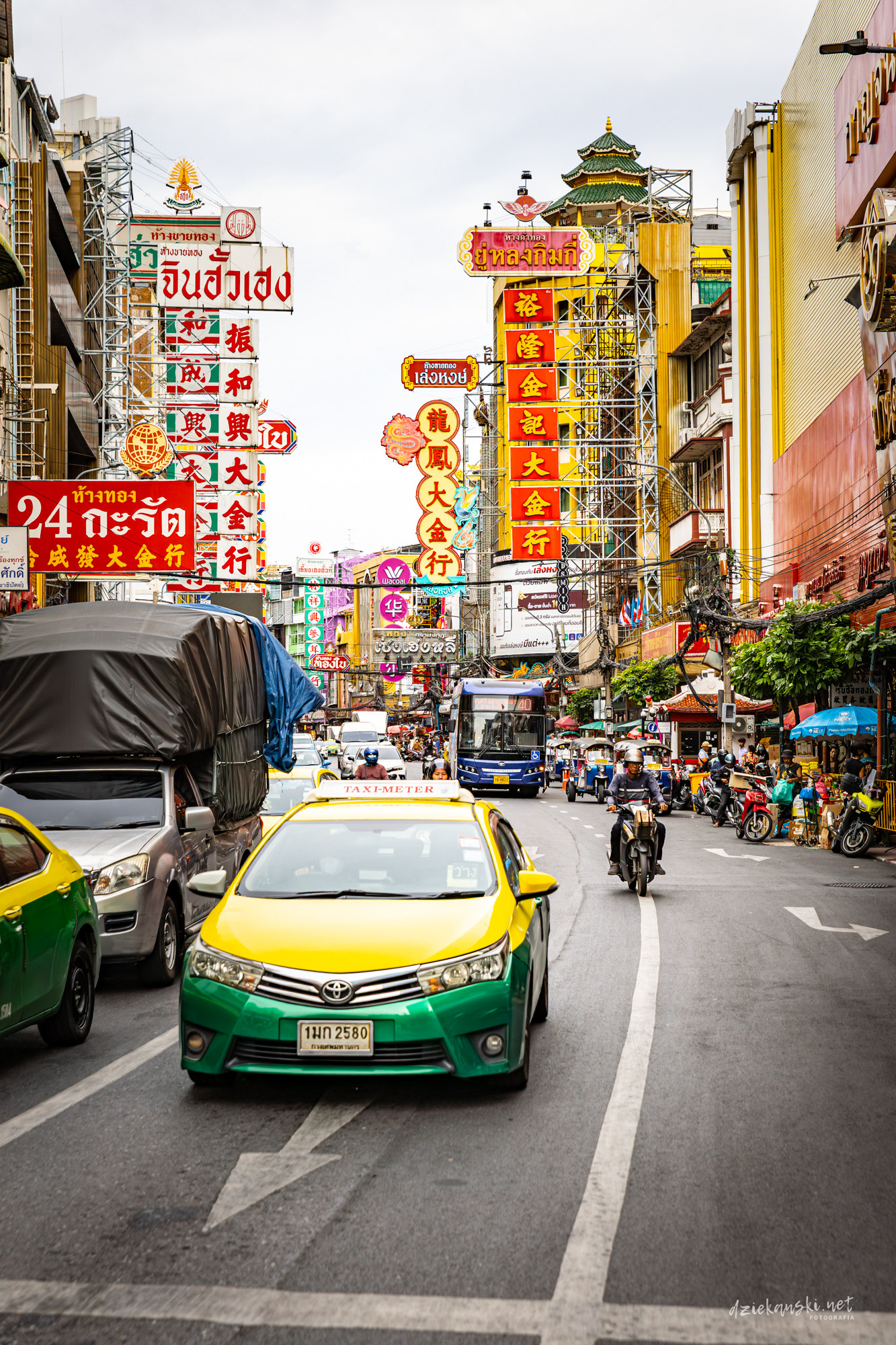 Tuk-tuk to ikoniczna, trójkołowa taksówka Bangkoku, która przeciska się przez ruch uliczny z hałasem i zawrotną prędkością. Przejażdżka nim to chaos i przygoda w jednym — kwintesencja Bangkoku.