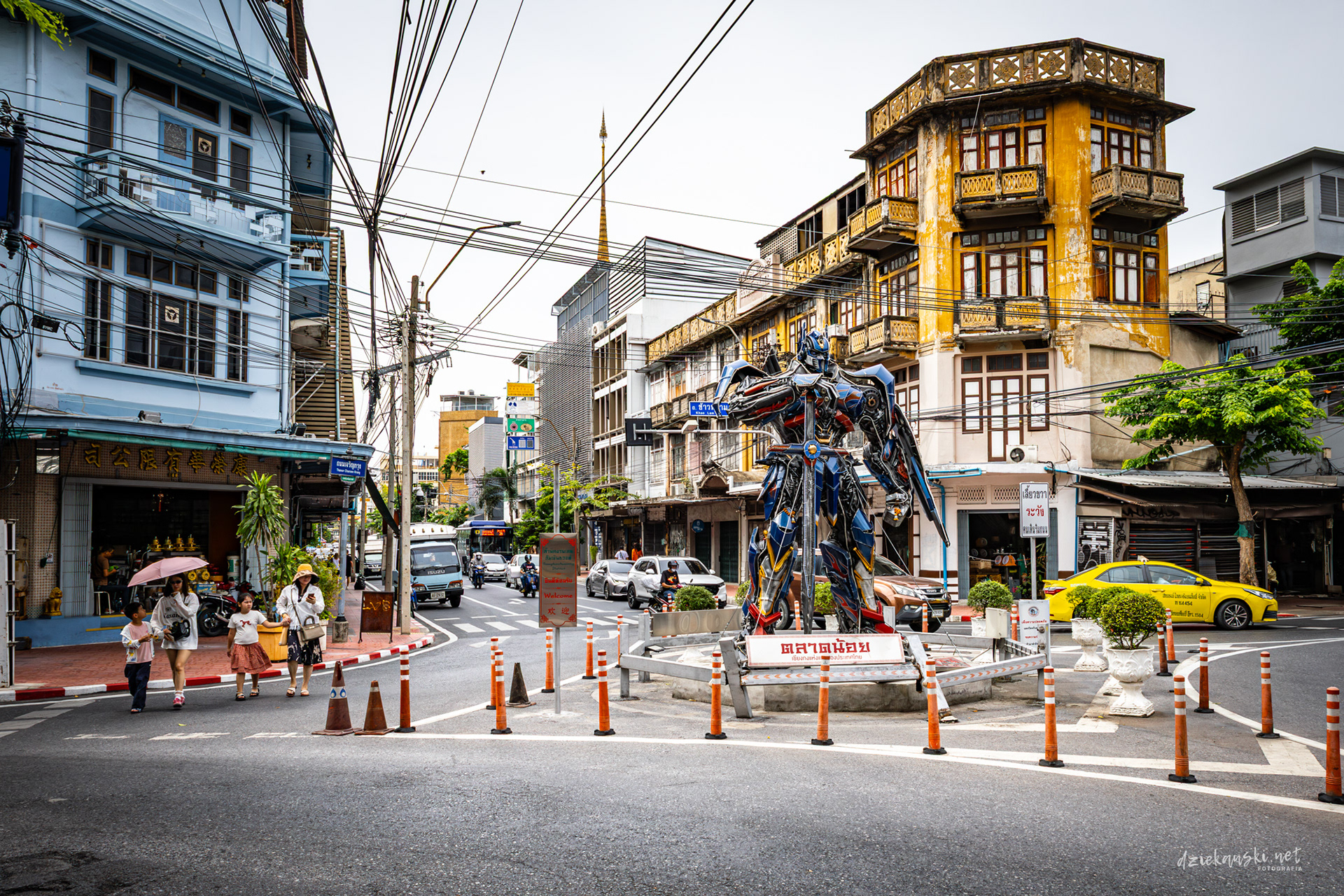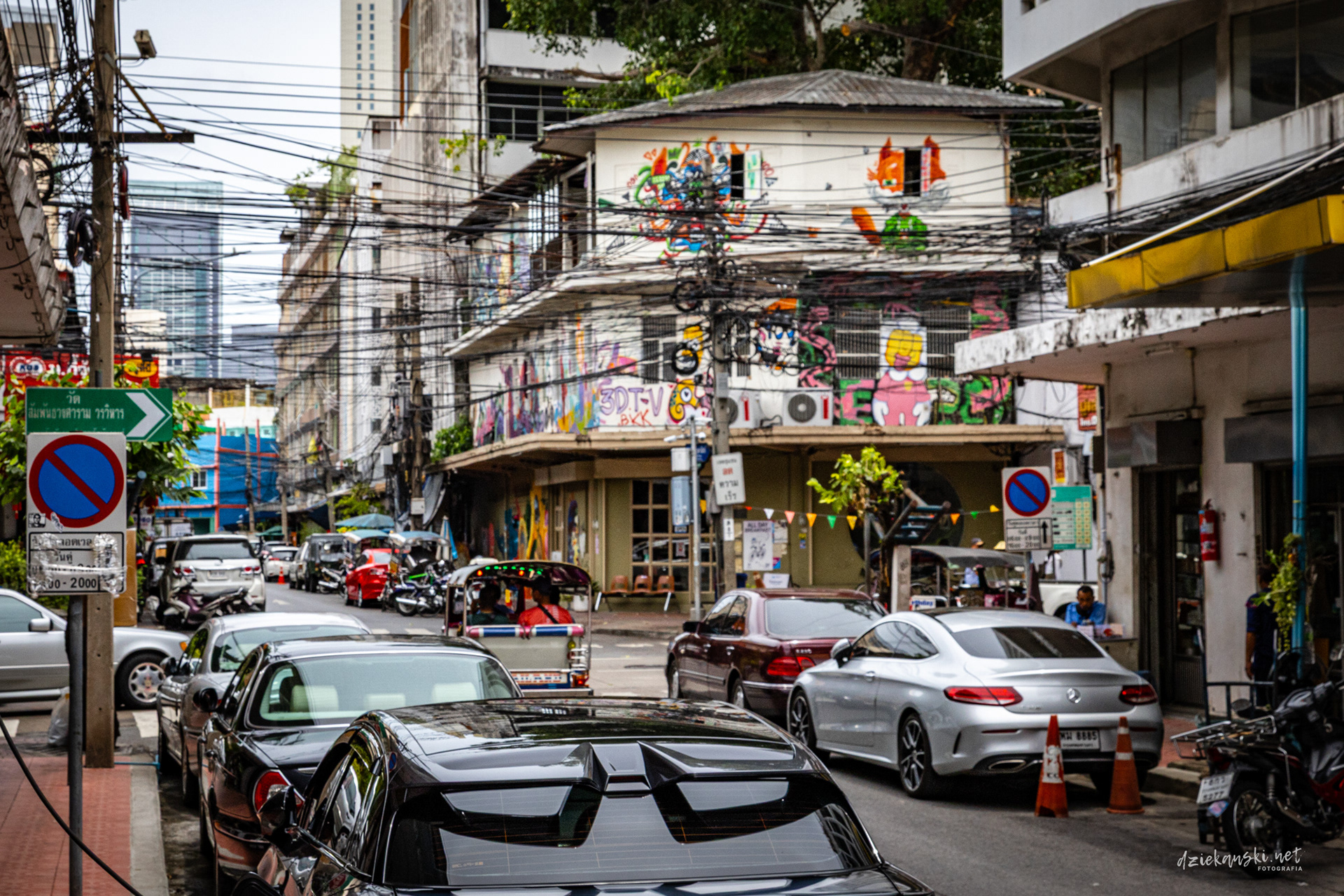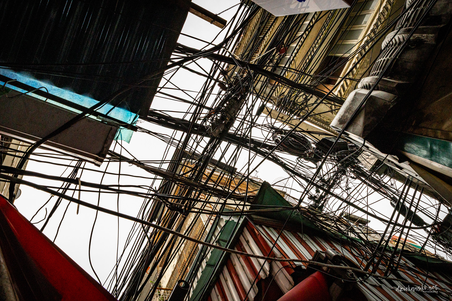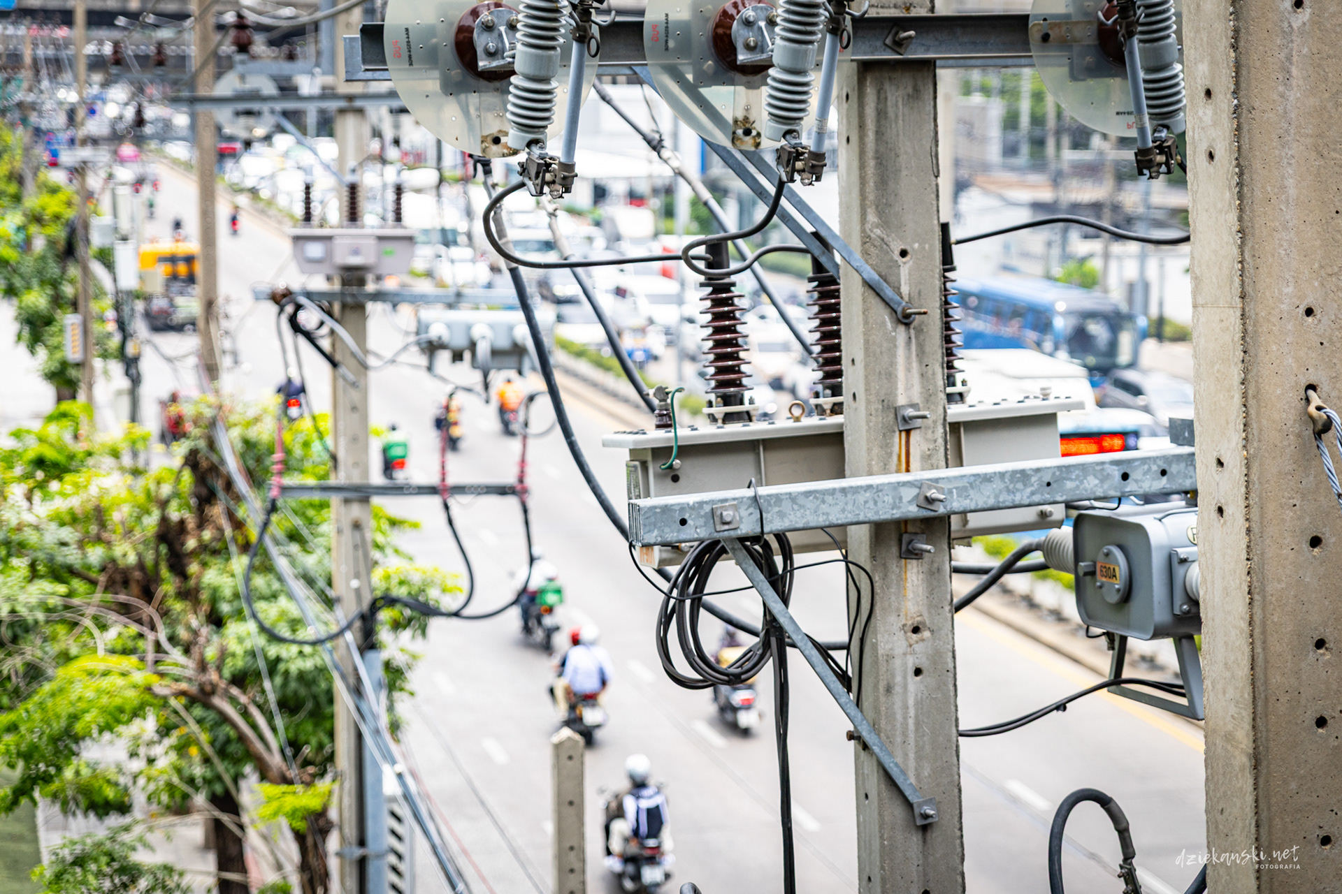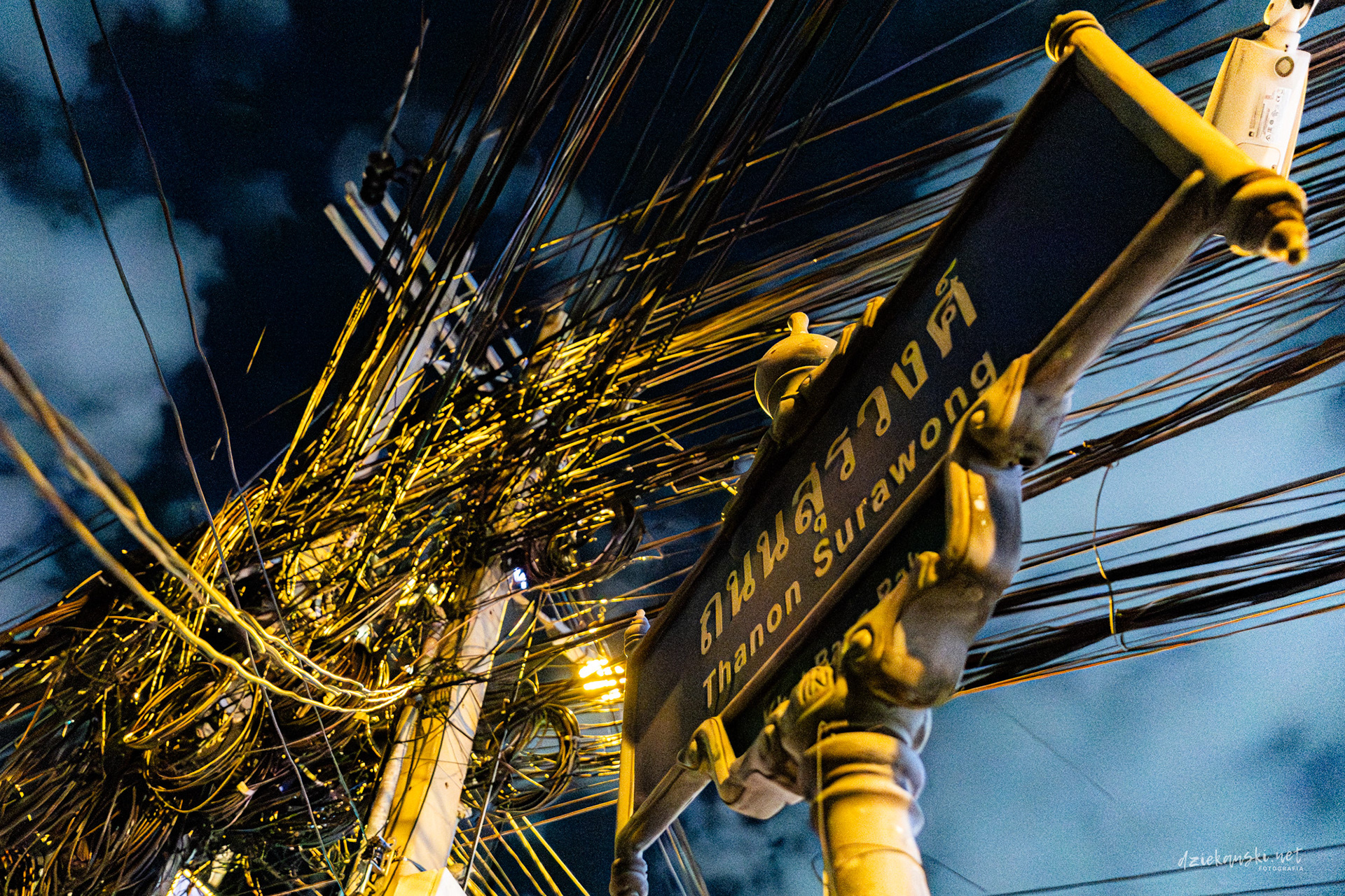 Panorama Bangkoku na poziomie ulicy wyróżnia się plątaniną czarnych kabli zwisających ze słupów. Te pajęczyny to mieszanka prądu, internetu i telefonii, stanowiąca charakterystyczny element miasta.