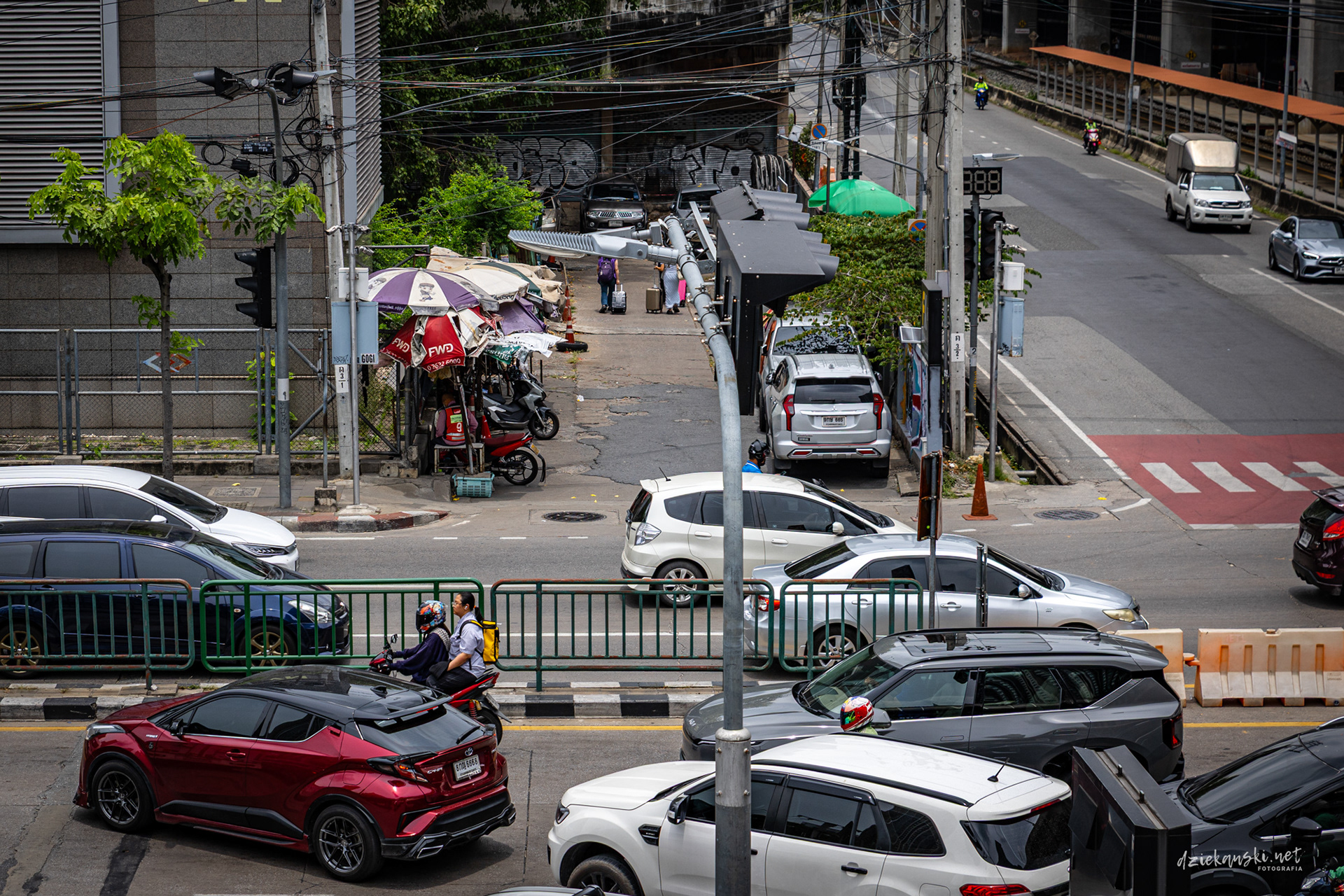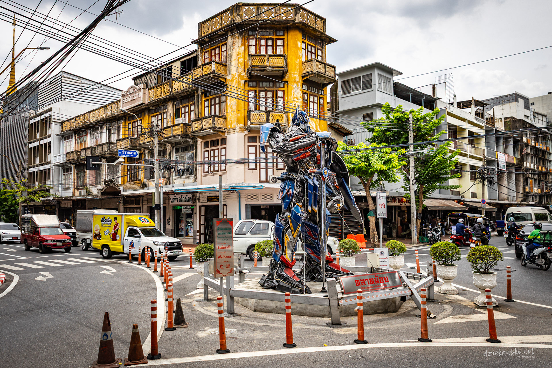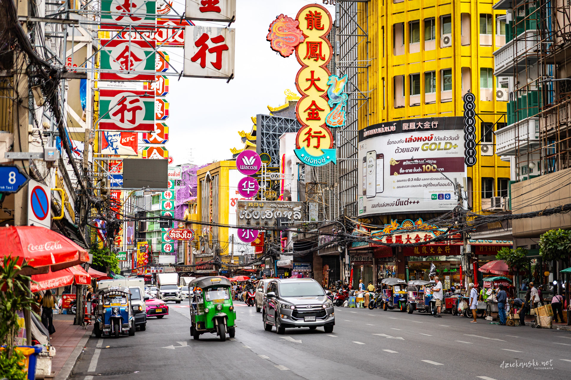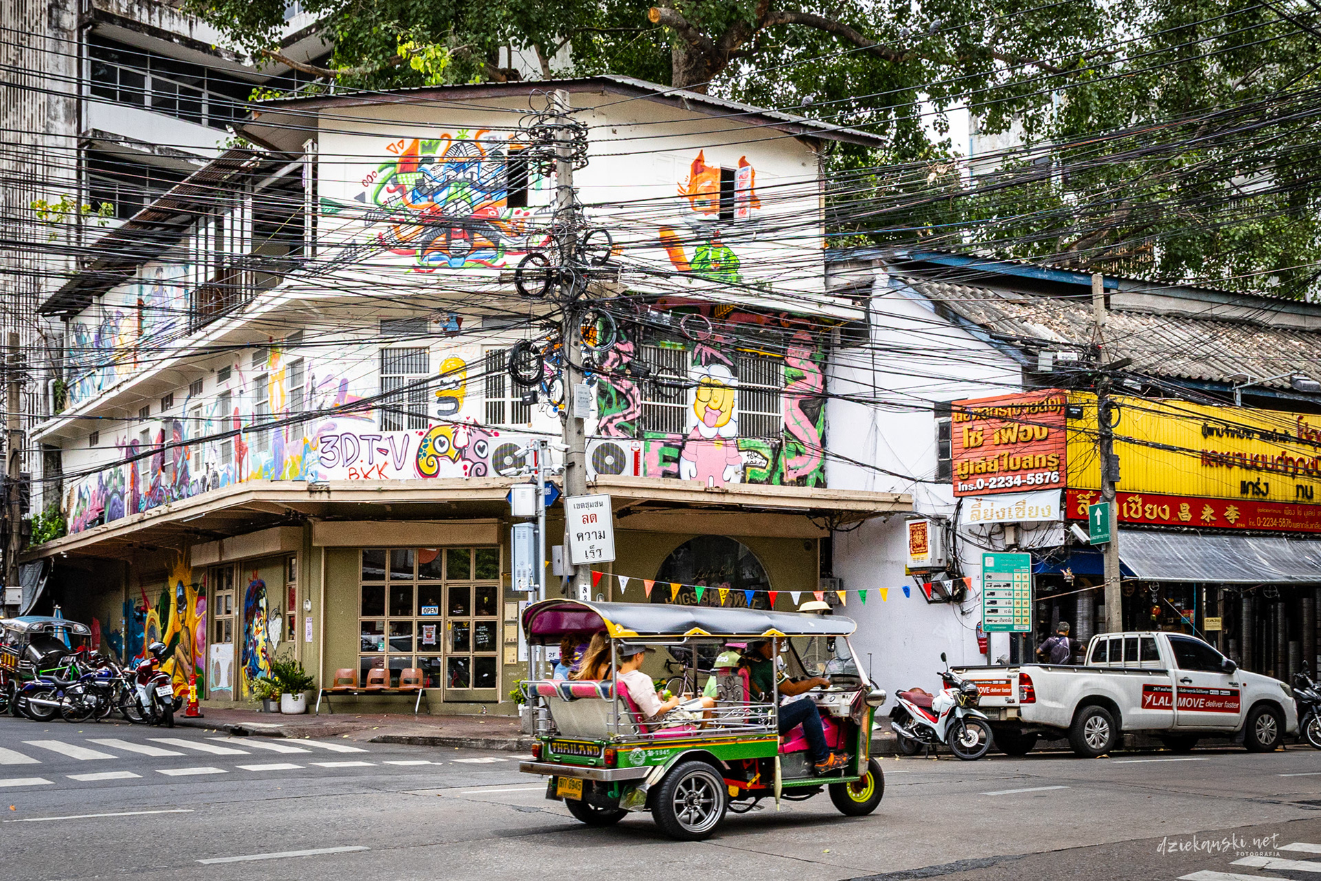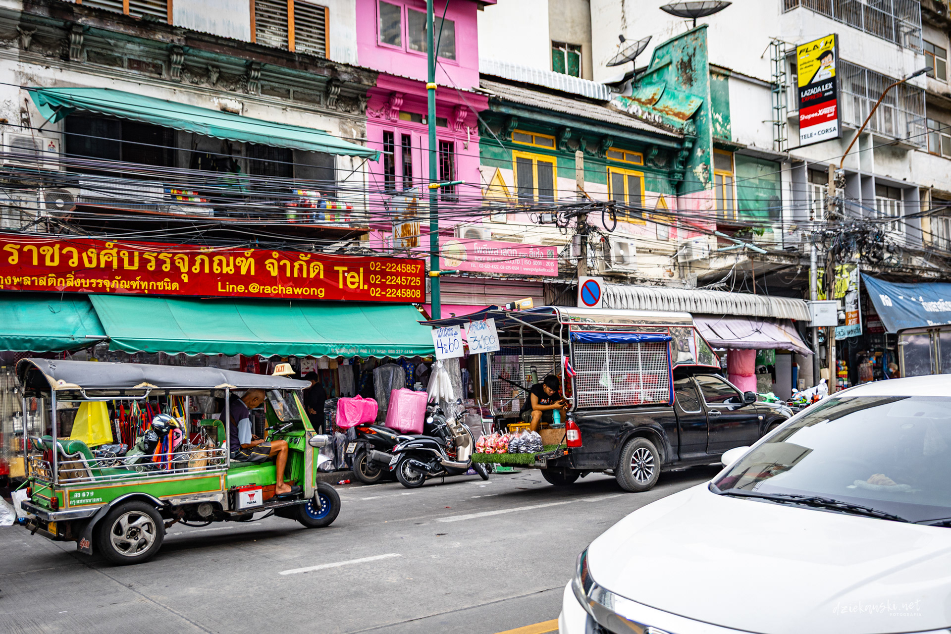 Panorama Bangkoku na poziomie ulicy wyróżnia się plątaniną czarnych kabli zwisających ze słupów. Te pajęczyny to mieszanka prądu, internetu i telefonii, stanowiąca charakterystyczny element miasta.